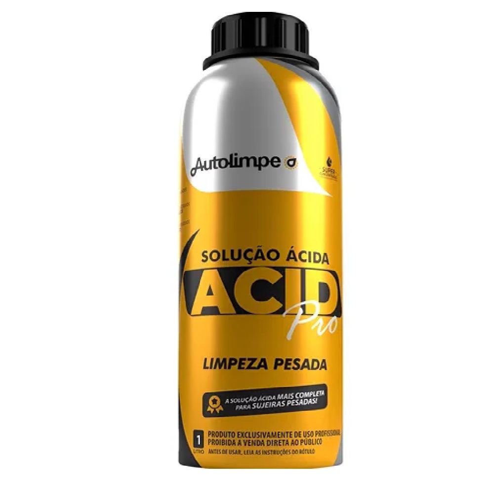01 - Acid Pro Solução Acida Autolimpe Limpeza Pesada Concentrado; PROMOÇÃO - FINALIDADE: Solução ácida, de uso profissional, para limpeza pesada de equipamentos industriais, chassis, peças metálicas, betoneiras, usinas de concreto, pós obra, pisos, pedras rústicas ou porosas, bordas de piscinas, cerâmicas, mármores, granitos e artefatos que contenham sujidades pesadas e incrustadas. - MODO DE USAR: Diluir o produto em água na proporção de 01 litro de produto para até 05 litros de água dependendo do nível de sujidade. Aplicar ou pulverizar a superfície, deixar agir por alguns minutos e enxaguar em seguida com jato d’ água até a remoção total do produto. No caso de sujidades mais pesadas e de difícil remoção,
