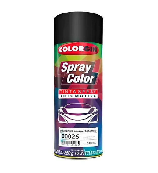 # Spray Colorgin Bumper Cross Preto 300ml # ----------------------------------------------------------------------------------------------------- Indicado para texturizar de peças plásticas. O produto possui excelente aderência, dureza e flexibilidade, tornando este produto bastante adequado para este tipo de aplicação. O Spray Color Preto Texturizado é de fácil aplicação e secagem rápida. Acabamento: Fosco/Texturizado Indicada para: retoques de automóveis e pinturas de motos. Rendimento Aproximado: de 1,3 m² a 1,7 m² por embalagem, por demão. Preparo da Superfície / Aplicação: Elimine a poeira, gordura ou qualquer contaminante; Aplique massa rápida de boa qualidade e espere secar, a fim de melhorar o nivelamento da superfície; Lixe com lixa d’água 320, seque bem e aplique COLORGIN USO GERAL PREMIUM PRIMER RÁPIDO; Após a secagem, lixe com lixa d’água 400 até a superfície ficar bem homogênea e lisa; Aplique as demãos necessárias do produto e espere secar.