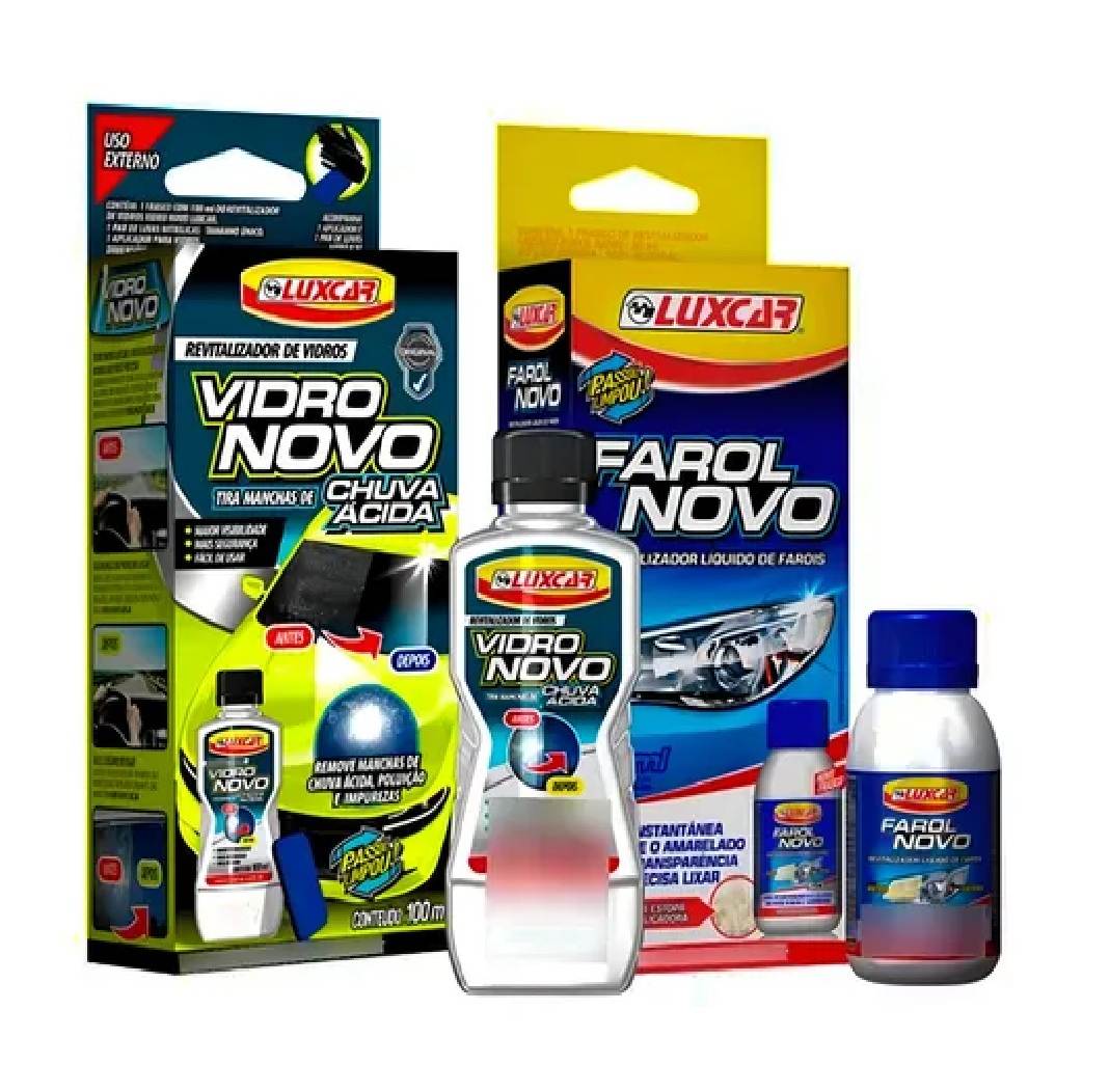 Kit composto por: 01un - Revitalizador de Farol Luxcar 01un - Revitalizador de vidros Luxcar REVITALIZADOR DE FAROL Com o Revitalizador Líquido Farol Novo Luxcar os faróis do seu carro ficam como se fossem recém-instalados em minutos, sem a necessidade de trocá-los, lixá-los ou polir. Remove o fosco, o queimado e o amarelado das lentes, melhorando o desempenho e luminosidade dos faróis. De ação rápida, o Farol Novo Luxcar é muito fácil de usar, é só aplicar com auxílio de uma estopa que acompanha o produto. REVITALIZADOR DE VIDROS O Revitalizador de Vidros Vidro Novo Luxcar é uma solução para remover as manchas de chuva ácida dos vidros dos carros. Com uma fórmula que elimina as manchas mais resistentes sem danificar o vidro. O produto acompanha um par de luvas nitrílicas e um aplicador que não arranha. Limpa, descontamina e previne o aparecimento de novas manchas, deixando os vidros mais transparentes e protegidos. Após a aplicação, os vidros dos carros tornam-se hidrofóbicos, repelindo água. Para usar, basta aplicar o produto com movimentos verticais e horizontais após a lavagem, enxaguar e secar. A remoção das marcas e manchas nos vidros aumenta a segurança ao dirigir, especialmente à noite. Um carro com os vidros limpos e transparentes tem sua estética melhorada. Com o Revitalizador de Vidros Vidro Novo Luxcar, as manchas nos vidros não são mais um problema.