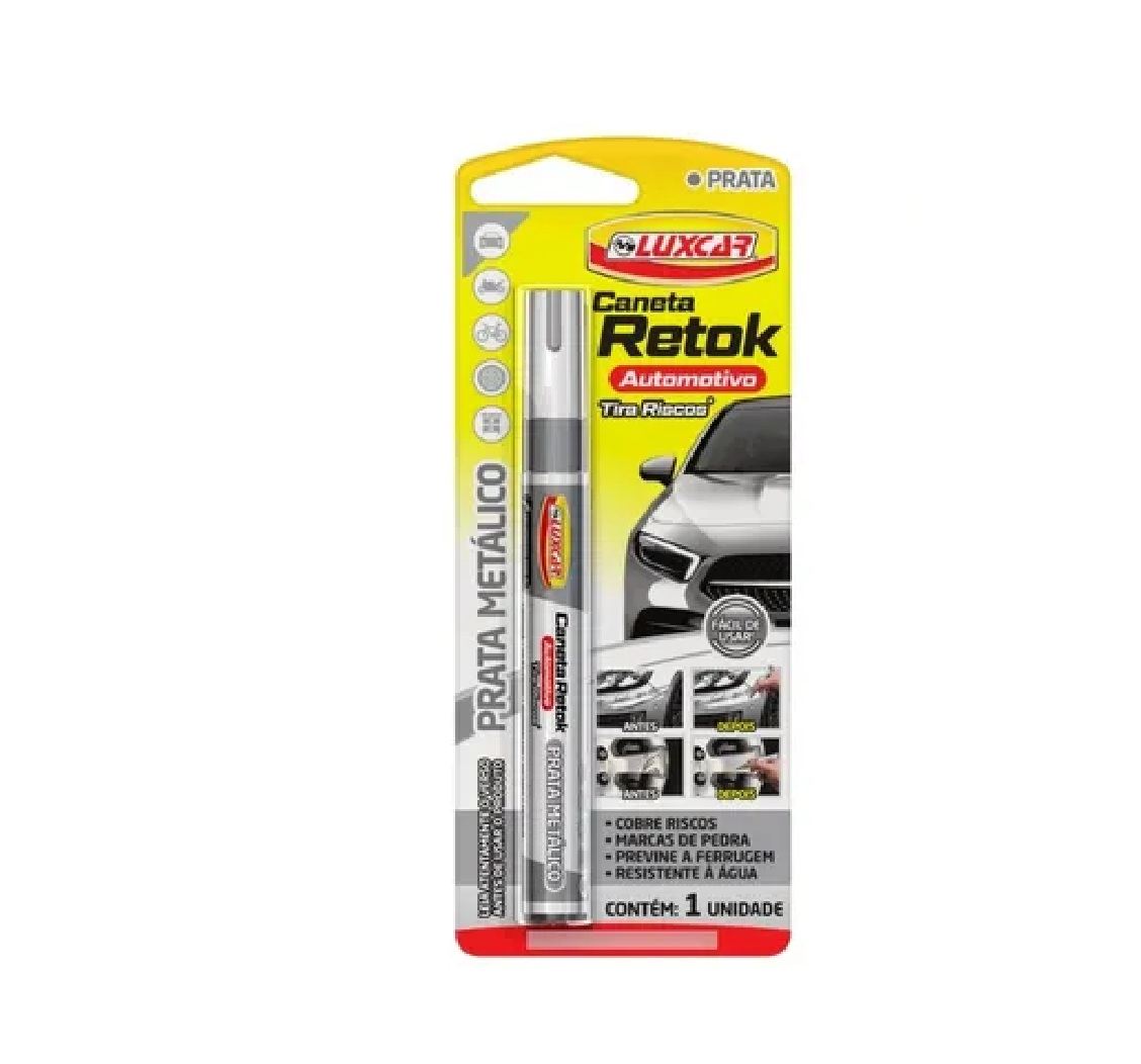 Caneta Retok Tira Riscos Prata Metálico A Caneta Retok Tira Riscos Luxcar oferece qualidade em seus marcadores permanentes que possuem o brilho da tinta automotiva envernizada. Ideal para disfarçar riscos, marcas de pedras, manchas ou falta de tinta nas superfícies do seu carro, moto, bicicleta ou qualquer outro veículo. Além disso, as canetas Retok Tira Riscos Luxcar também podem ser usadas para pintar pneus, restaurar móveis, rodas, placas, personalizar detalhes no painel ou em aparelhos eletrônicos. As possibilidades são infinitas! Vantagens: • Cobre Riscos. • Marcas de Pedra. • Previne a Ferrugem. • Resistente a água. Modo de usar: Primeiro, lave e seque bem a área a ser retocada. Depois, agite bem a caneta antes de usar e remova a tampa. Em seguida, pressione a ponta da caneta sobre uma superfície lisa até que a tinta comece a sair. Aplique a tinta sobre o risco ou arranhão, com movimentos suaves e contínuos. Deixe secar por cerca de 30 minutos. Se necessário, repita o processo até obter o resultado desejado. Por fim, guarde a caneta em local fresco e seco, com a tampa bem fechada. As Canetas Retok Tira Riscos Luxcar também podem ser usadas para pintar pneus, restaurar móveis, rodas, placas, personalizar detalhes no painel ou em aparelhos eletrônicos. As possibilidades são infinitas! Este produto incrível foi testado e aprovado pelo maior especialista em canetas do mundo, Manoel Gomes, o Caneta Azul! No vídeo ao lado ele vai mostrar como usar as canetas e dar dicas incríveis para você.