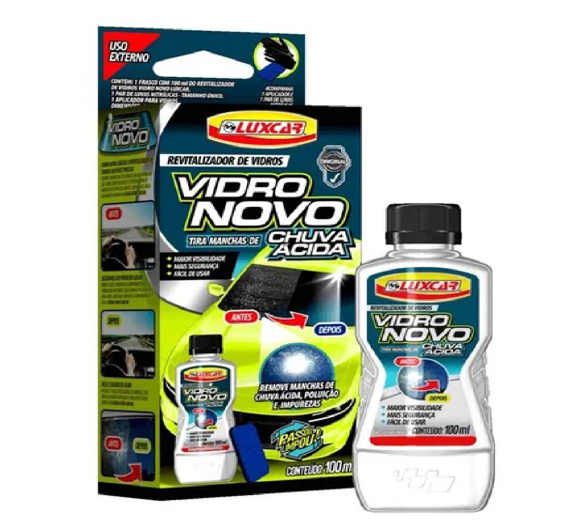 Revitalizador de Vidros Chuva Ácida Vidro Novo Luxcar - 100 ml Elimine Manchas de Chuva Ácida, Poluição e Impurezas! Com uma fórmula exclusiva, o Revitalizador de Vidros Vidro Novo Luxcar remove as manchas mais resistentes sem danificar o vidro. O produto acompanha um par de luvas nitrílicas e um aplicador que não arranha. Ele não só limpa e descontamina, mas também previne o aparecimento de novas manchas, deixando os vidros mais transparentes e protegidos por muito tempo. Os vidros dos carros ficarão hidrofóbicos, repelentes à água! Para usar, basta aplicar o produto com movimentos verticais e horizontais após a lavagem, enxaguar e secar! Além de melhorar a estética do carro, a remoção das marcas e manchas nos vidros aumenta a segurança ao dirigir, especialmente à noite, quando os faróis dos carros podem ofuscar a visão do motorista se houver manchas nos vidros. Um carro com os vidros limpos e transparentes fica mais valorizado. Vantagens: • Ação instantânea • Inclui par de luvas e aplicador exclusivo • Remove as manchas mais difíceis com facilidade • Alto rendimento • Mais visibilidade e segurança Modo de usar: 1 - À sombra, longe do sol e com os vidros frios: lave e seque-os muito bem antes de aplicar o vidro novo luxcar. 2 - Coloque um pouco do produto no aplicador, cuidado para não derramar em nenhuma parte do carro ou chão. 3 - Nos vidros dianteiro e traseiro, faça aplicação dividindo-os em 3 partes. Sempre com movimentos horizontais e verticais. 4 - Enxágue com água corrente cada parte imediatamente após a aplicação. Caso seja necessário, repita a aplicação do produto. IMPORTANTE: não deixe o produto secar nos vidros, caso isso ocorra, umedecer novamente o aplicador com o produto, reaplicar e enxáguar na sequência. Caso derrame o produto sobre a lataria, faróis, plásticos, borrachas ou chão, remova imediatamente com água corrente para não manchar. Não utilize outro tipo de aplicador ou esponja, só o fornecido nesta embalagem. Não usar em vidro que não seja original. Não usar em espelhos retrovisores ou vidros blindados. Não usar em para-brisas trincados ou com riscos mais profundos ocasionados pelas palhetas. Antes de usar, faça um teste de compatibilidade: • Baixe o vidro do carro e realize o teste na parte do limite superior, assim, caso ocorra algo indesejado, ao subir o vidro, essa parte não ficará visível. • Realize o teste em uma área de 2 cm². • Faça a aplicação conforme as instruções de uso. • Ao final do teste, o vidro deve ficar com água aderida, sem manchas e sem opacidade.