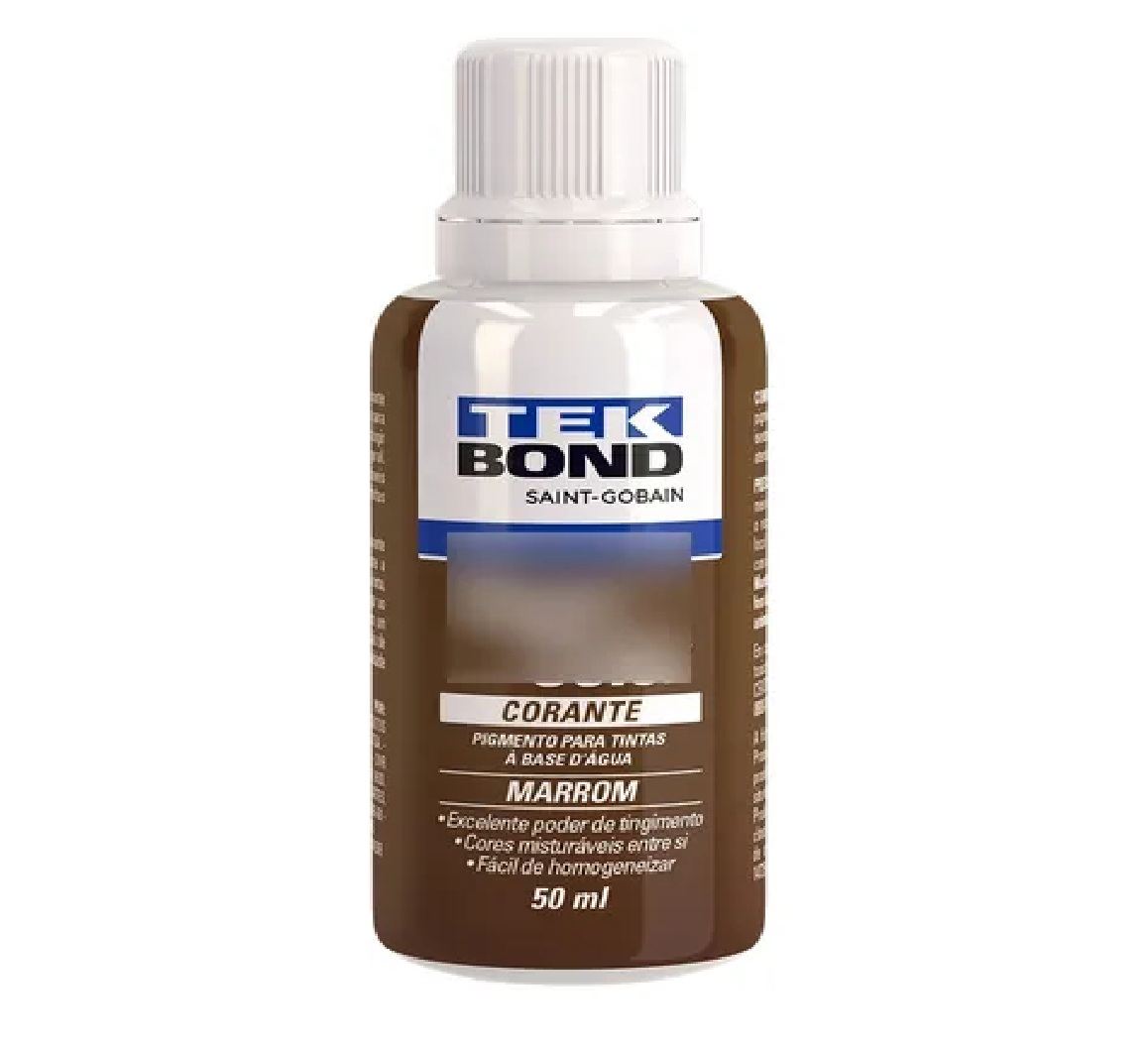Corante Líquido Super Color Crie infinitas cores com o Corante Líquido Tekbond à Base D’Àgua para tintas decorativas. Indicado para tingir tintas à base d’àgua em geral. Disponível em 10 cores misturáveis entre si, possibilitando infinitas combinações de cores. Descrição A Linha de Corante Líquido Tekbond à Base d’Àgua, é uma linha completa Disponível em 10 cores misturáveis entre si, possibilitando infinitas combinações de cores. Com excelente poder de tingimento, pode ser utilizado em diversas aplicações. Propriedades • Excelente poder de tingimento • Cores misturáveis entre si • Fácil de homogeneizar • Versátil Armazenamento e Validade Manter em local coberto, seco, isento de poeira e livre de calor e raios ultravioleta. Mantenha a embalagem fechada e fora do alcance de crianças e animais. Armazenar em local com temperatura entre +5oC e +27oC e umidade entre 30% e 70%. 48 meses de validade. Composição Água, aditivos e pigmentos orgânicos e/ou inorgânicos isentos de metais pesados. Modo de uso: Agite bem o Corante Líquido Tekbond antes e durante a aplicação. Adicione-o aos poucos à tinta, sempre sobre agitação, até chegar ao tom desejado. Utilize no máximo um frasco (50ml) de corante por galão de tinta 3,6 L, mantendo essa proporcionalidade para as demais embalagens.