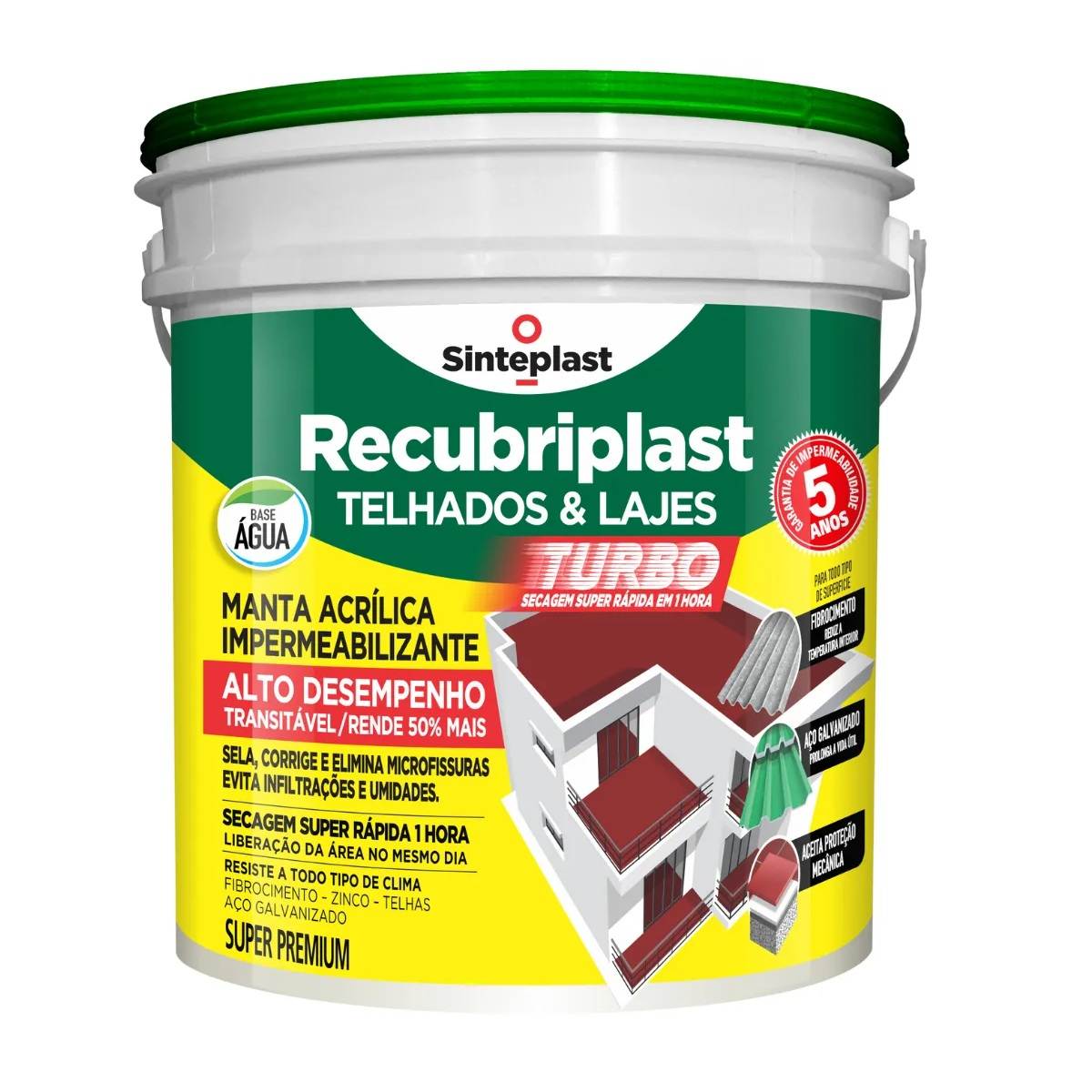Descrição: Impermeabilizante acrílico indicado para telhados, lajes e coberturas em geral. Aplicado nas condições recomendadas, após o período de cura, forma uma película emborrachada, monolítica (sem emendas), impermeável, de elevada aderência, resistente aos raios UV (o que permite que fique exposto ao tempo dispensando proteção mecânica). Dicas de aplicação: Toda superfície a ser impermeabilizada e que requeira escoamento de água deve ter um caimento de 1,0% em direção aos coletores de água. Utilizando a cor branco, consegue moderar o efeito de radiação solar diminuindo de 2 a 3ºC no ambiente interno.